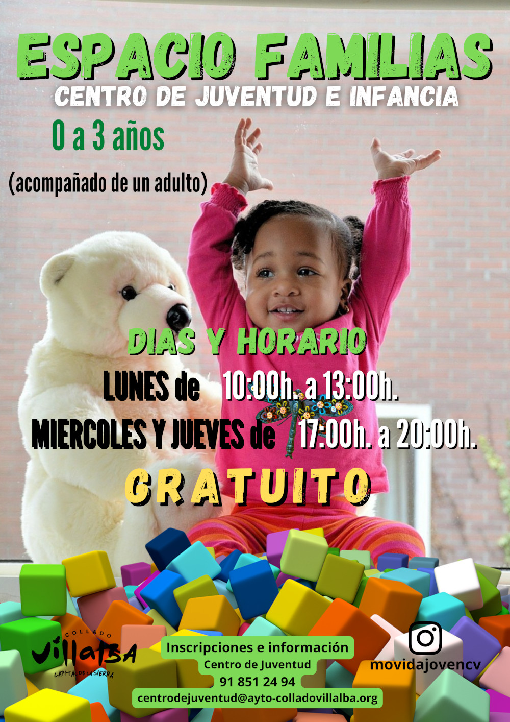La Concejalía de Infancia y Juventud pone en marcha un nuevo ‘Espacio para familias’, dirigido a niños de 0 a 3 años, acompañados de un adulto, que podrán disfrutar de un aula preparada los lunes de 10:00 a 13:00 h. y miércoles y jueves de 17:00 a 20:00 h.