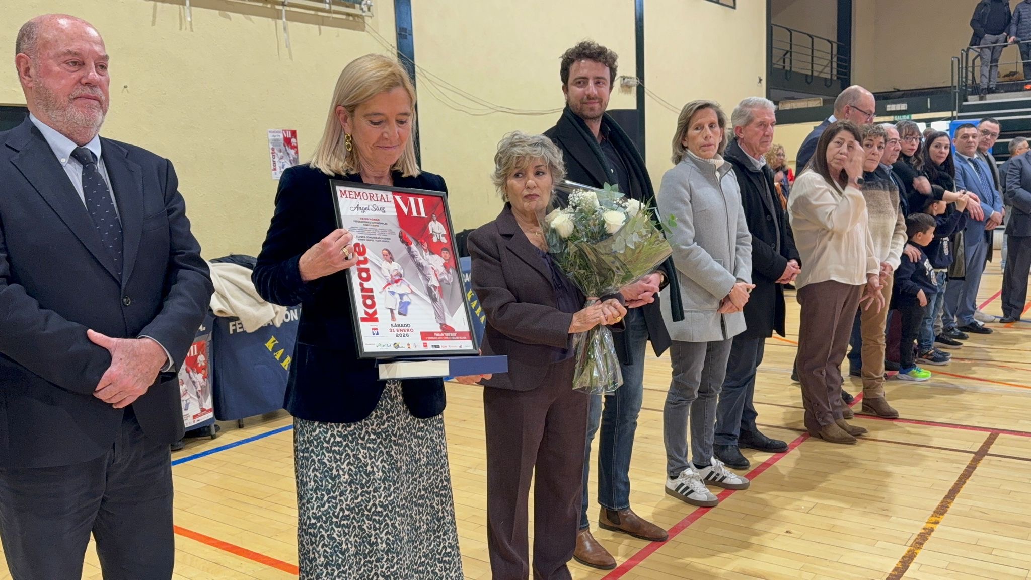 Tras el acto de entrega de premios, el presidente de la Federación Madrileña de Kárate, Antonio Torres, hizo entrega de un ramo de flores a la viuda de Ángel Sáez, fallecido en 2017, que en su día fue vicepresidente de la Federación Madrileña y artífice de los prestigiosos torneos celebrados en Collado Villalba a lo largo de los últimos 30 años.