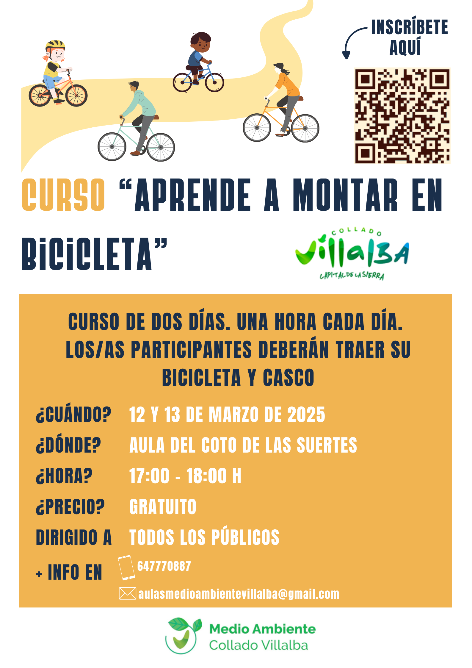 El Ayuntamiento de Collado Villalba, a través del área de Medio Ambiente, organiza un “Curso para aprender a montar en bicicleta”, abierto a personas de cualquier edad, que se celebrará los días 12 y 13 de marzo de 17:00 a 18:00 h.
