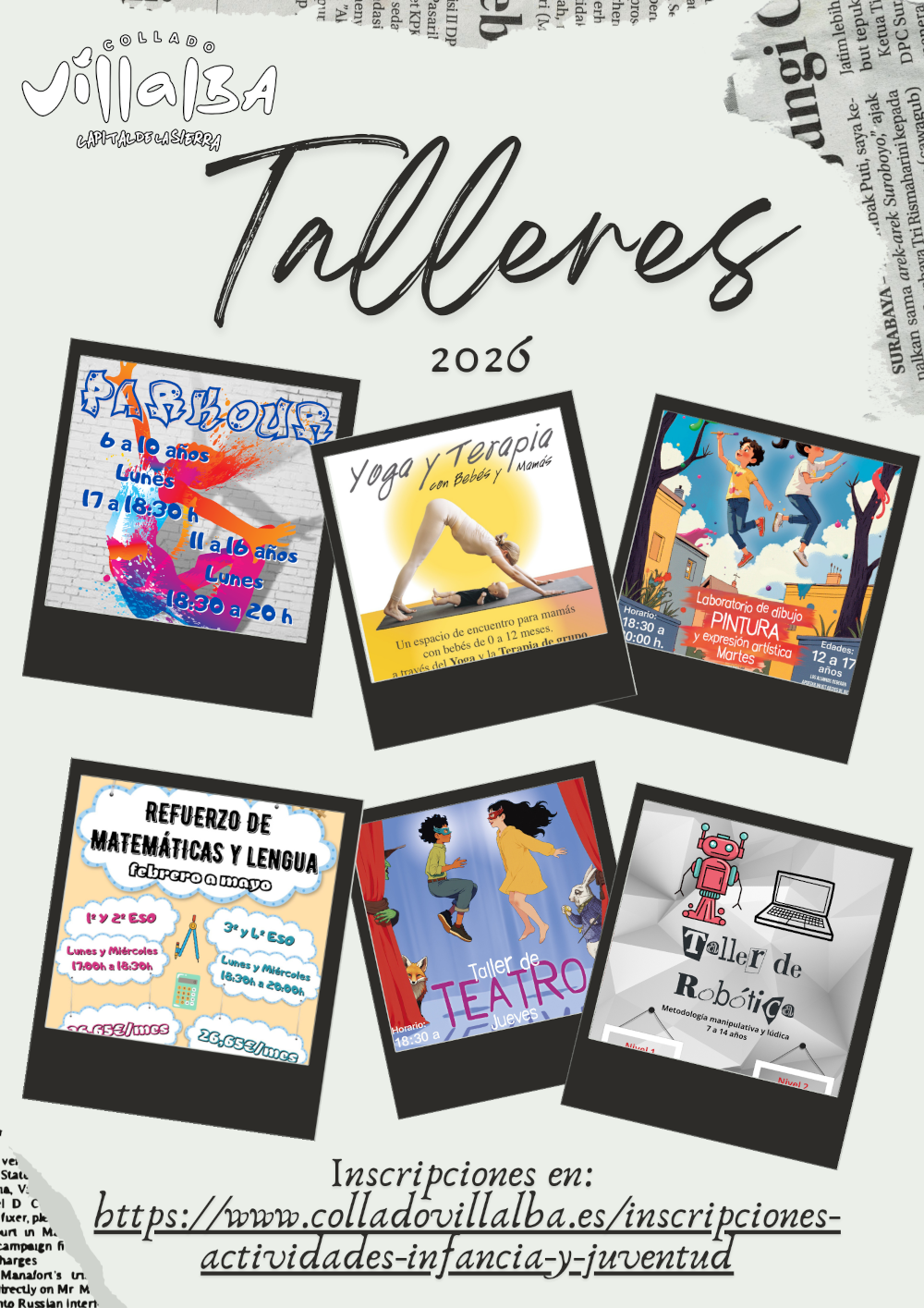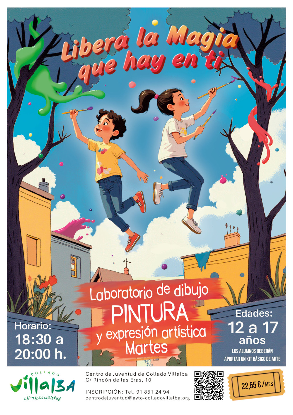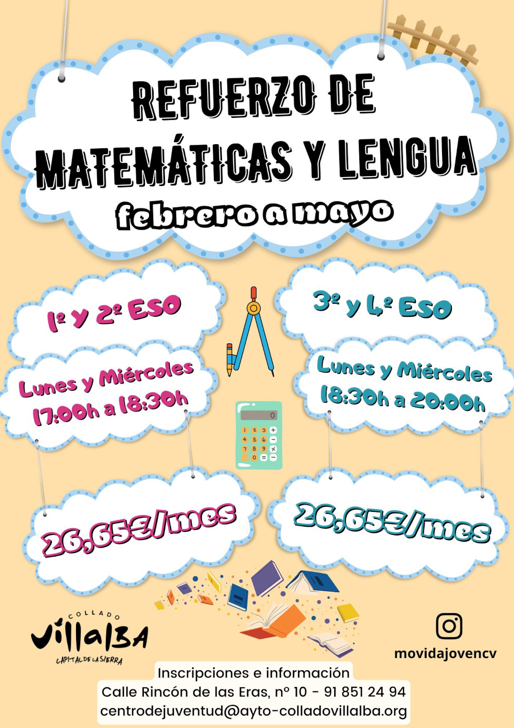 Las actividades se realizan un día a la semana, con una duración de hora y media por sesión, y tienen un precio público de 22,55 euros mensuales por taller y de 26,65 en el caso de las clases de refuerzo. Todas las actividades se imparten en el Centro de Juventud de Collado Villalba, en la calle Rincón de las Eras, 10.