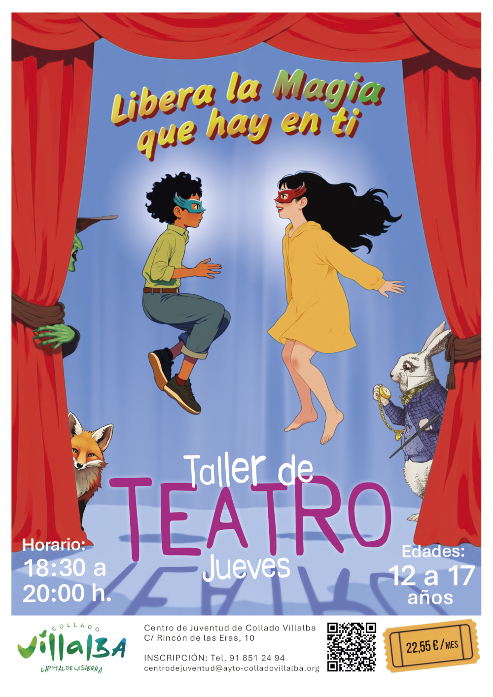 Los jueves es el turno del Taller de Teatro, con sesiones a las 17:00 h. para niños y niñas de 8 a 11 años y a las 18:30 h. para jóvenes de 12 a 17 años. Esta actividad permite iniciarse en el mundo de la interpretación mediante el juego y la expresión corporal, favoreciendo el desarrollo de habilidades comunicativas, la empatía, el trabajo en equipo y la seguridad en uno mismo.