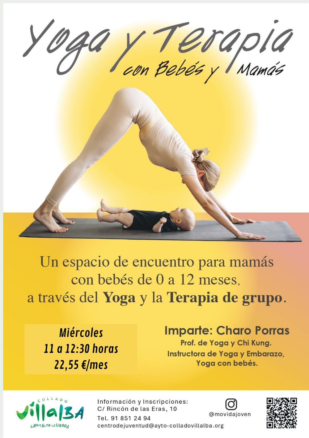 Los miércoles, de 11:00 a 12:30 h., se desarrolla el taller de Yoga para bebés, dirigido a recién nacidos acompañados de madres y padres recientes. Esta actividad contribuye al desarrollo psicomotor del bebé, favorece la relajación y el bienestar emocional y refuerza el vínculo afectivo familiar, además de ofrecer un espacio de apoyo y cuidado para las familias en esta etapa inicial.