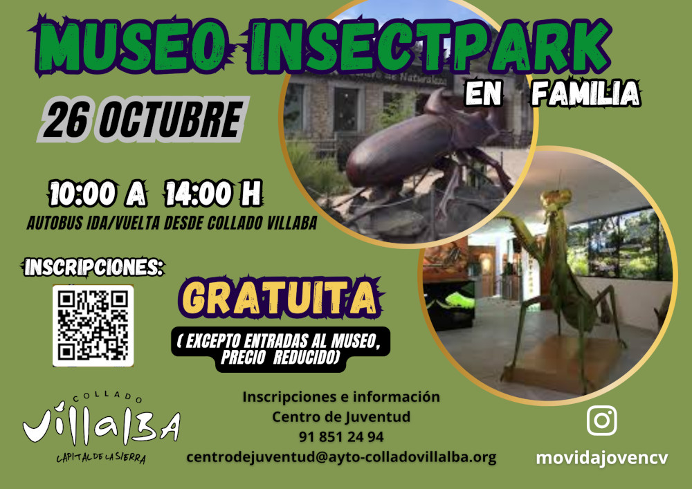La actividad es gratuita, previa inscripción, e incluye autobús de ida y vuelta desde Collado Villalba, así como la asistencia de un monitor acompañante durante toda la actividad, que se desarrollará de 10:00 a 14:00 h. La entrada a Insect Park no está incluida, por lo que los participantes deberán sacar sus tickets en las taquillas, a su llegada al centro. Al ser una actividad grupal, disfrutarán de un precio reducido de 6 € por entrada.
