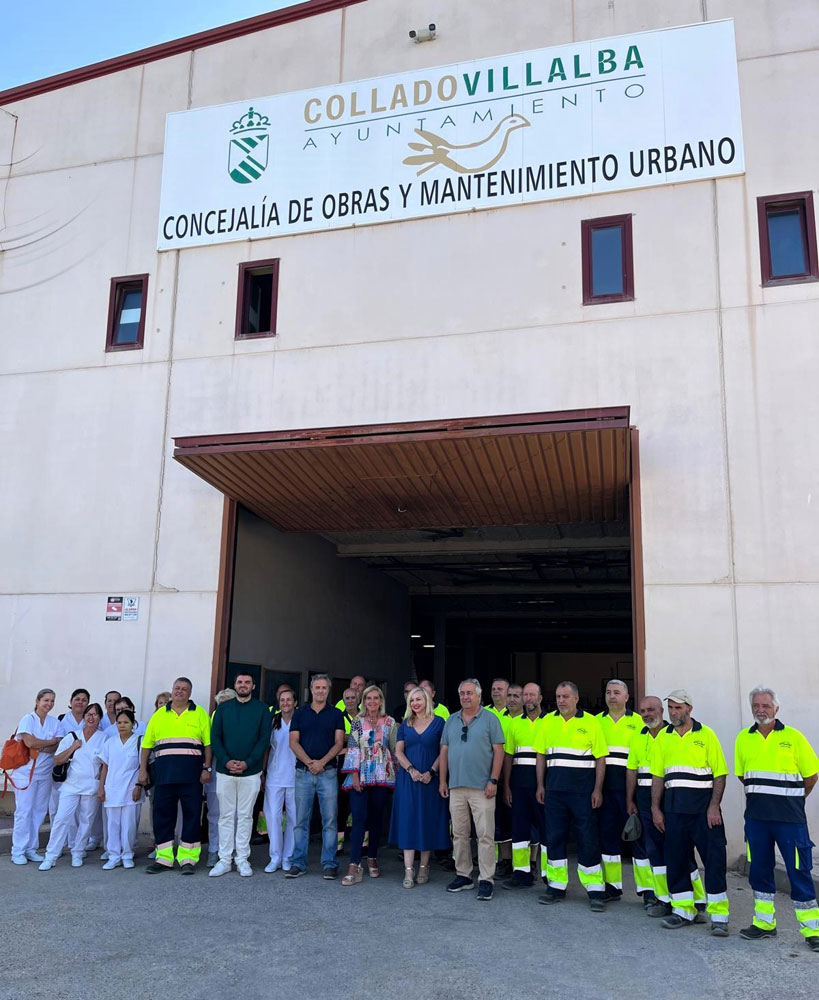 La alcaldesa de Collado Villalba, Mariola Vargas, junto con los concejales de Empleo, Servicios a la Ciudad y Recursos Humanos -Estela Mosquera, Ramón Pavón y Miguel Aisa, respectivamente- les han dado la bienvenida, este viernes, 19 de julio, en la nave de la Concejalía de Obras y Mantenimiento Urbano.