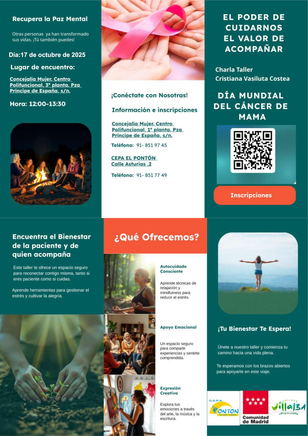 El viernes 17 de octubre, en el Aula de Mujer (edificio Polifuncional. Plaza Príncipe de España s/n), a las 12:00 h., se celebrará la charla-coloquio ‘El Poder de cuidarnos, el valor de acompañar’, con entrada libre y gratuita hasta completar aforo. El acto contará con la participación de Cristiana Vasiluta, que relata en un libro su lucha contra la enfermedad.