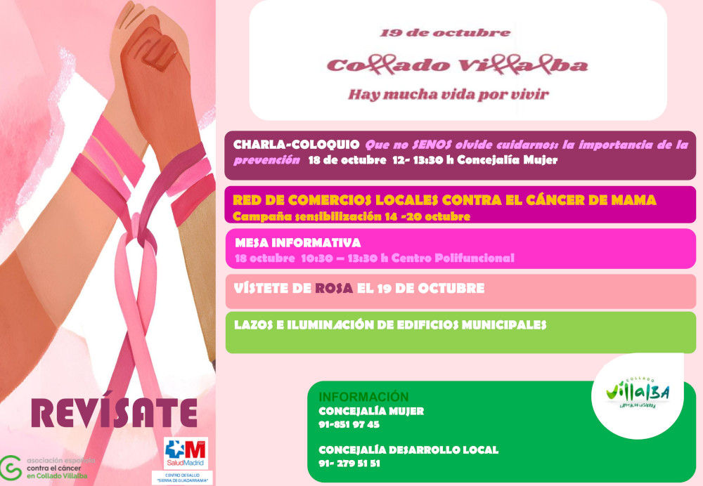 Con motivo de la celebración del Día Mundial del cáncer de mama, el próximo 19 de octubre, el Ayuntamiento de Collado Villalba ha organizado un completo programa de actividades, como muestra de su compromiso en la lucha frente a esta enfermedad.