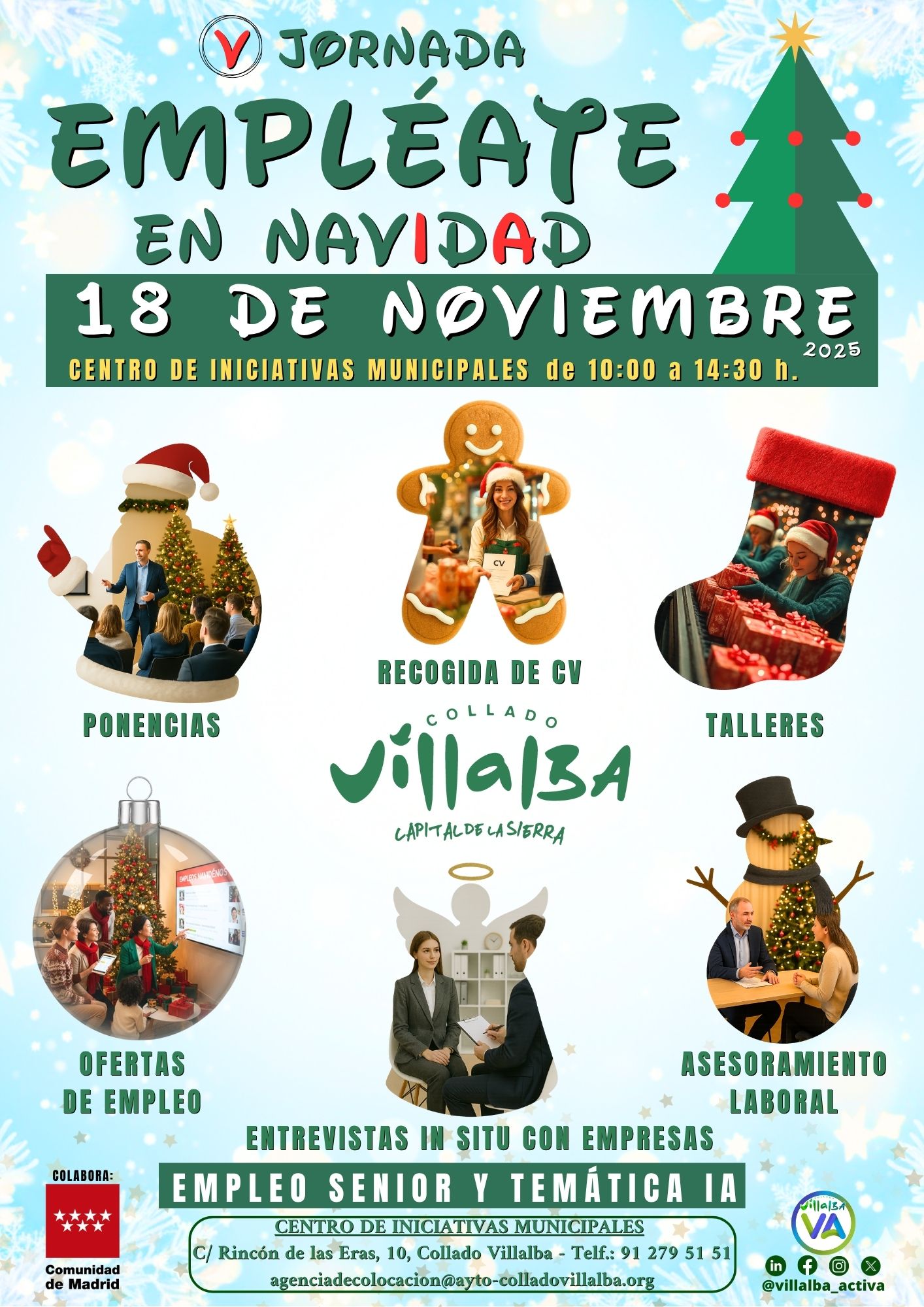 El Ayuntamiento de Collado Villalba, a través de la Concejalía de Empleo, Formación y Empresas, organiza el próximo martes 18 de noviembre la V edición de la Jornada de Empleo ‘Empléate en Navidad’, que se celebrará en el Centro de Iniciativas Municipales.