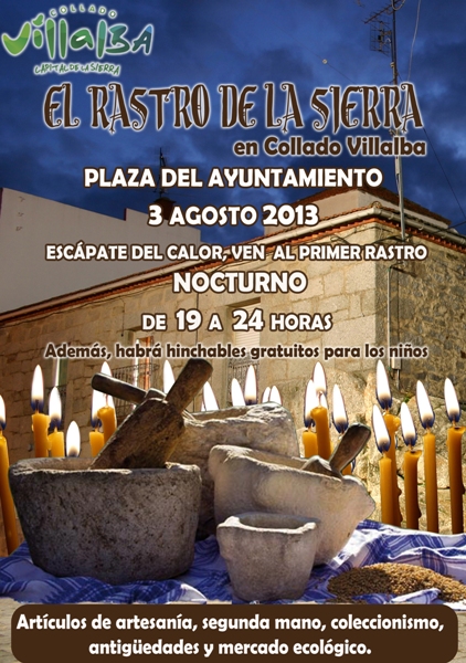 ‘El Rastro de la Sierra, en Collado Villalba', vuelve este sábado 3 de agosto, tras el éxito de visitantes y expositores de las pasadas ediciones, y en esta ocasión, en pleno verano, con horario de tarde- noche, de 19 a 24 h.