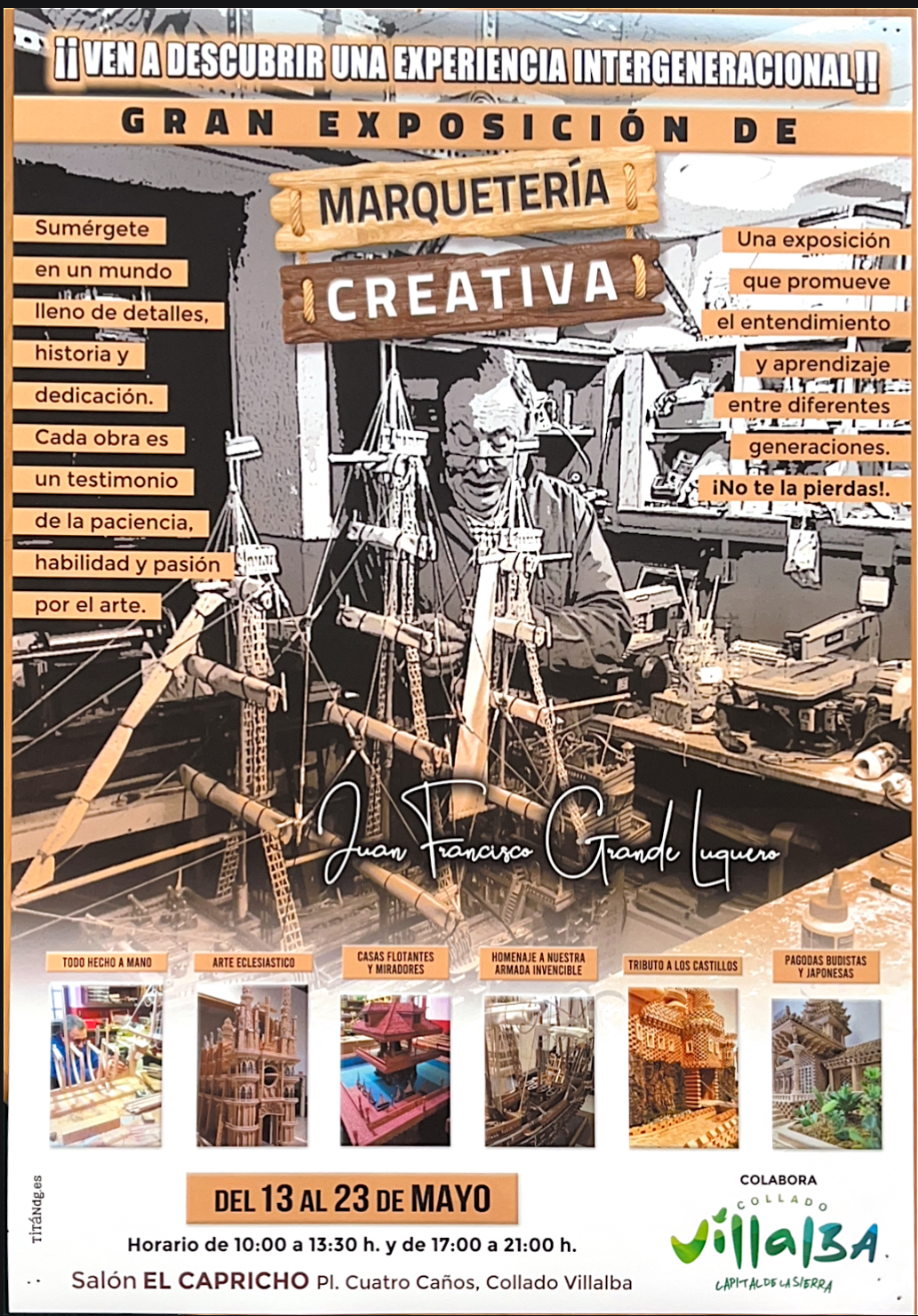 El Salón El Capricho abre sus puertas al público a partir de mañana, martes 13 de mayo, para mostrar al público una original exposición de marquetería creativa, a cargo del artista villalbino Juan Francisco Grande Luquero.