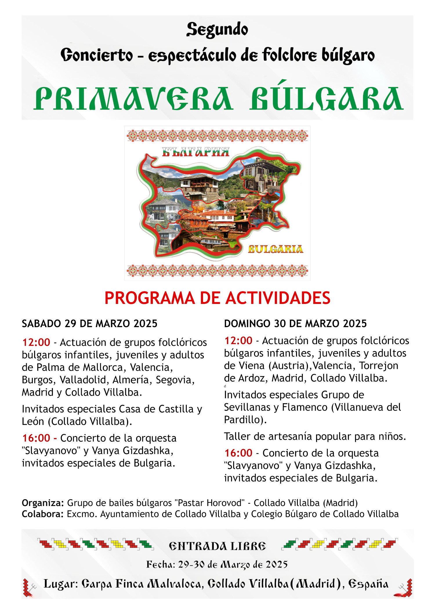 La Carpa de la Malvaloca acoge este fin de semana el evento ‘Primavera Búlgara’, organizado por la Asociación Europea de Integración de Inmigrantes Búlgaros Aeiibe Svetlina, con la colaboración del área de Participación Ciudadana del Ayuntamiento de Collado Villalba, con motivo de la celebración, recientemente, de esta fiesta tradicional del país europeo.