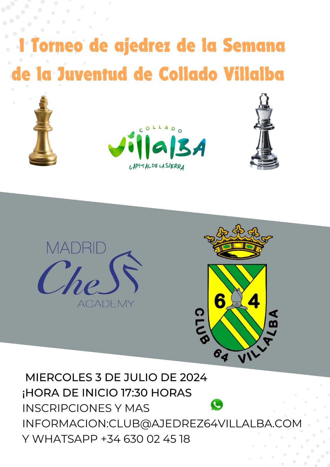 I Torneo de Ajedrez Semana de la Juventud Fecha 27 junio 2024 Miércoles 3 de julio. I Torneo de Ajedrez Semana de la Juventud Lugar: Centro de Juventud Horario: 17:30 21:00 h. Inscripciones: club@ajedrez64villalba.com / whatsapp 630024518