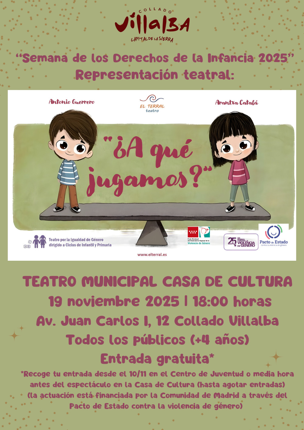 El Ayuntamiento de Collado Villalba invita a las familias a asistir a la representación teatral ‘¿A qué jugamos?’, de la compañía El Terral Teatro, dentro de los actos de la Semana de los Derechos de la Infancia 2025.