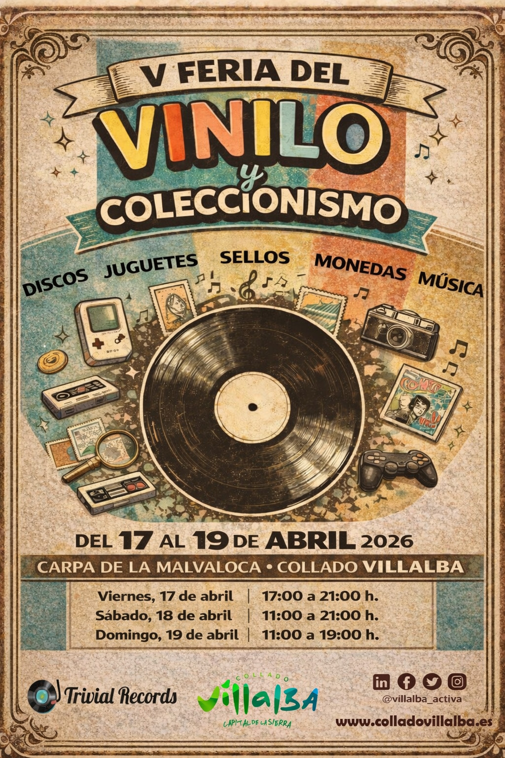 Del 17 al 19 de abril la Carpa Malvaloca acoge la V Feria del Disco del Vinilo y Coleccionismo, una muestra organizada por el Ayuntamiento de Collado Villalba, desde el Área de Desarrollo Local, con la colaboración de Trivial Records, con el fin de mejorar la promoción comercial y turística de la ciudad.