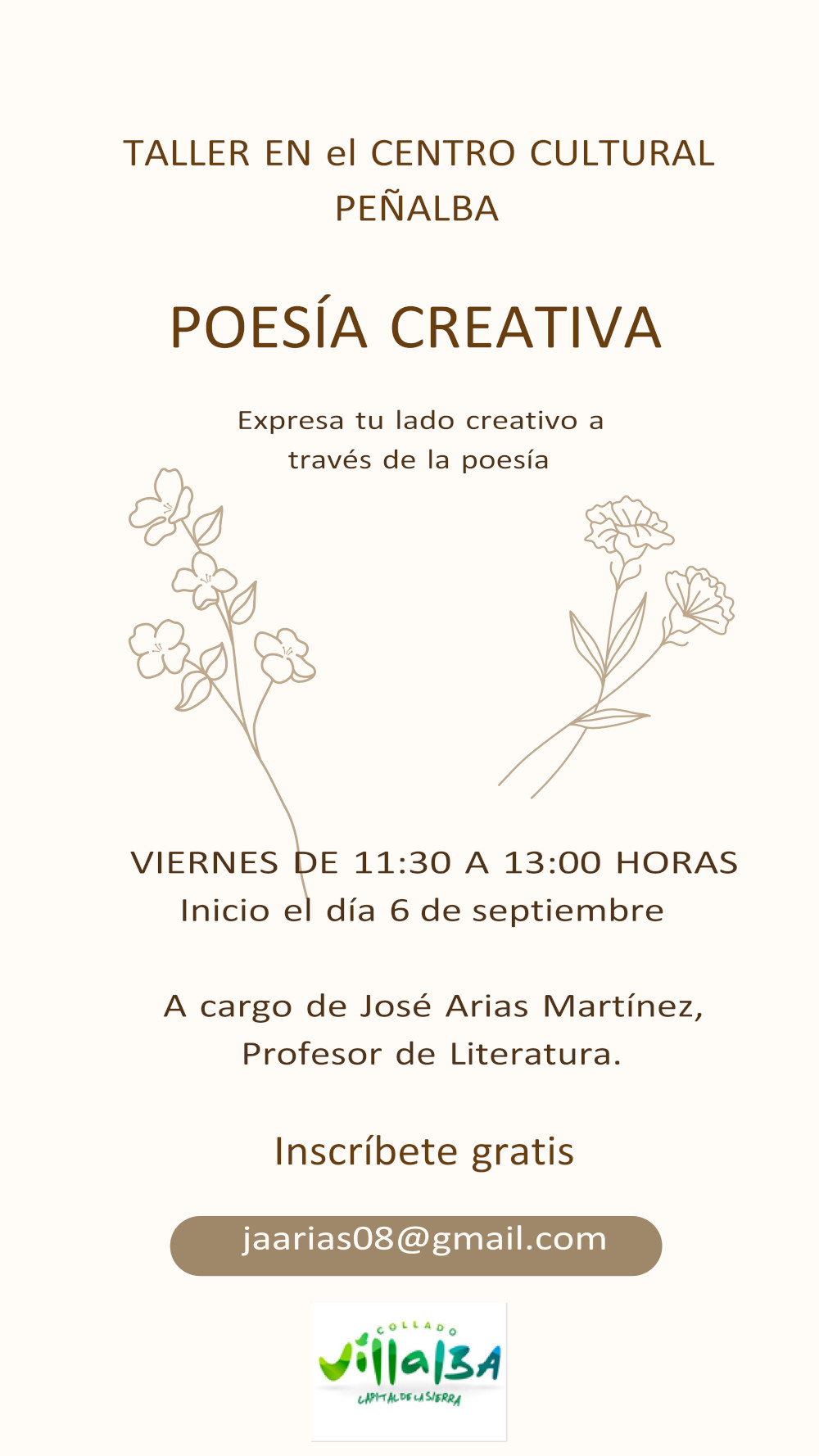 La Concejalía de Educación del Ayuntamiento de Collado Villalba ha organizado un ‘Taller de Poesía Creativa’, que se celebrará todos los viernes por la mañana, a partir del 6 de septiembre, en horario de 11:30 h. a 13:00 h., con inscripción gratuita.