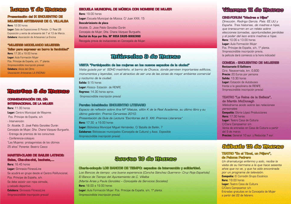 Este acto se enmarca dentro del completo programa de actividades que ha organizado el Ayuntamiento con motivo de la celebración ese día, el 8 de marzo del Día Internacional de la Mujer . Este programa se extenderá hasta el sábado 12 de marzo durante la Semana de la Mujer 2011 e incluye exposiciones, concursos, encuentros culturales, visitas, conferencias, teatro o una comida encuentro de encuentro entre mujeres. Las inscripciones para las actividades incluidas en el programa (excepto la comida) son totalmente gratuitas y pueden realizarse en la Concejalía de Mujer, en el edificio Polifuncional.