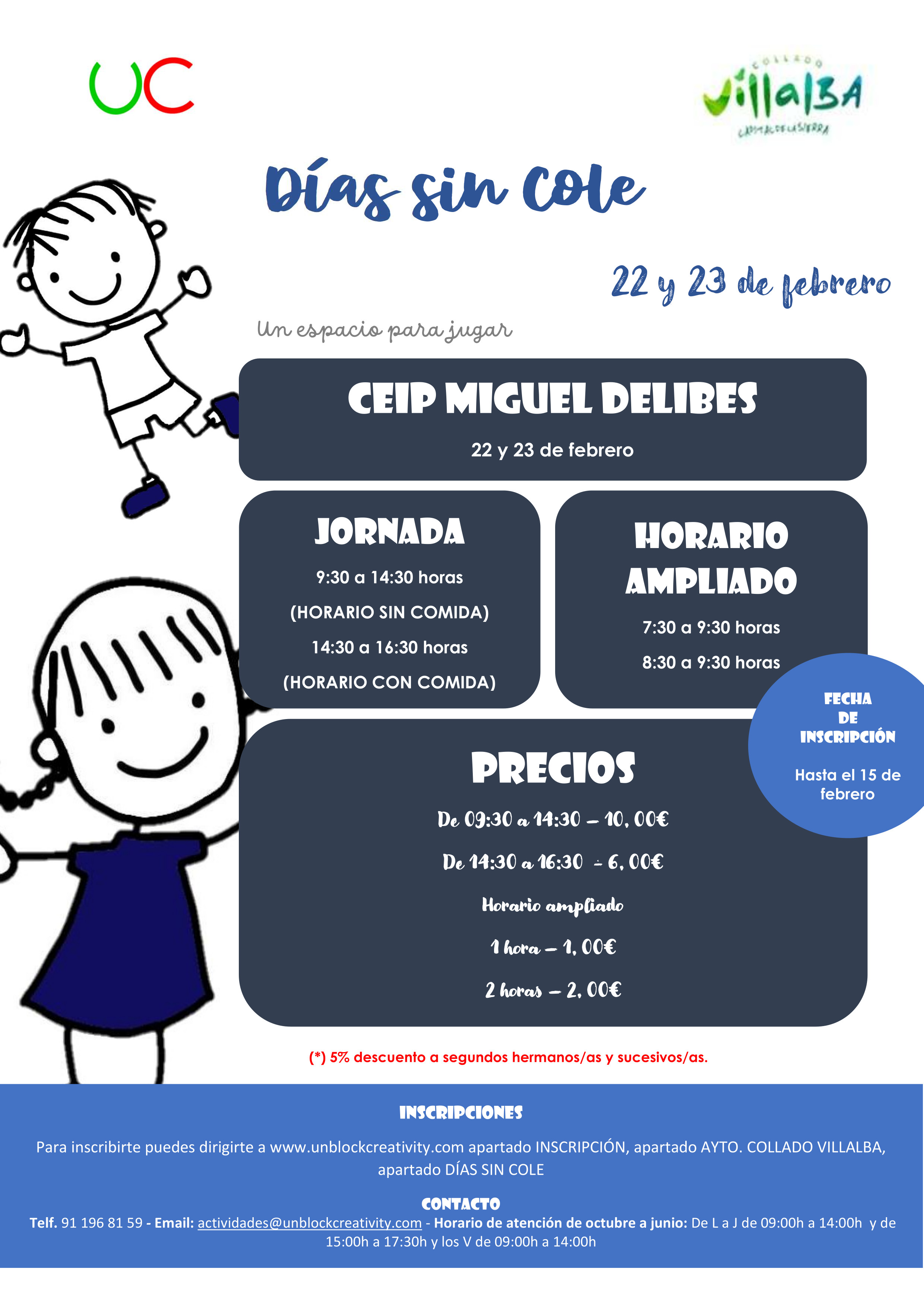 El CEIP Miguel Delibes abrirá sus puertas con posibilidad de horario ampliado y flexible, según las necesidades de los padres, de 7:30 a 16:30 h. Se trata de una iniciativa de la Concejalía de Educación de Collado Villalba con el fin de ayudar a las familias que deben trabajar en aquellos días no lectivos pero sí laborables.