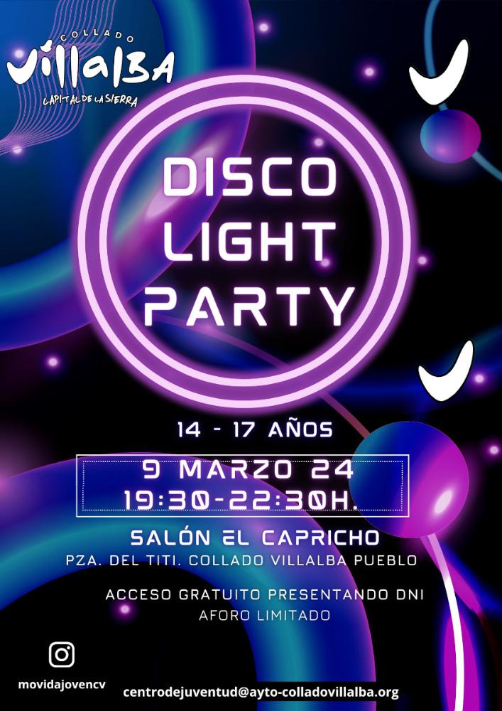 Ofrecer un espacio de ocio saludable durante el fin de semana para los jóvenes de Collado Villalba. Con este propósito, el área de Juventud e Infancia del Ayuntamiento organiza el próximo sábado 9 de marzo, en el Salón El Capricho, la primera Disco Light Party, dirigida a jóvenes de entre 14 y 17 años.
