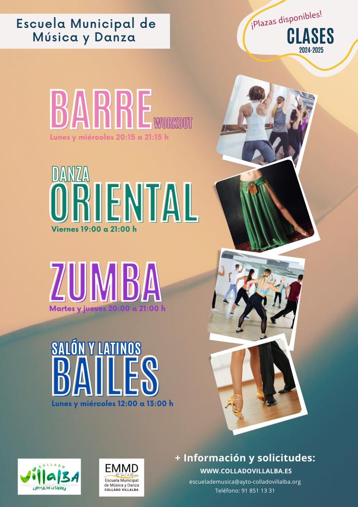 30-10-2024.- La Escuela Municipal de Música y Danza del Ayuntamiento de Collado Villalba oferta diferentes plazas disponibles en varias disciplinas, como danza oriental, zumba, bailes de salón y latinos, y barre work-out, esta última modalidad combina las prácticas de ballet, pilates y yoga, con ejercicios en barra y suelo.