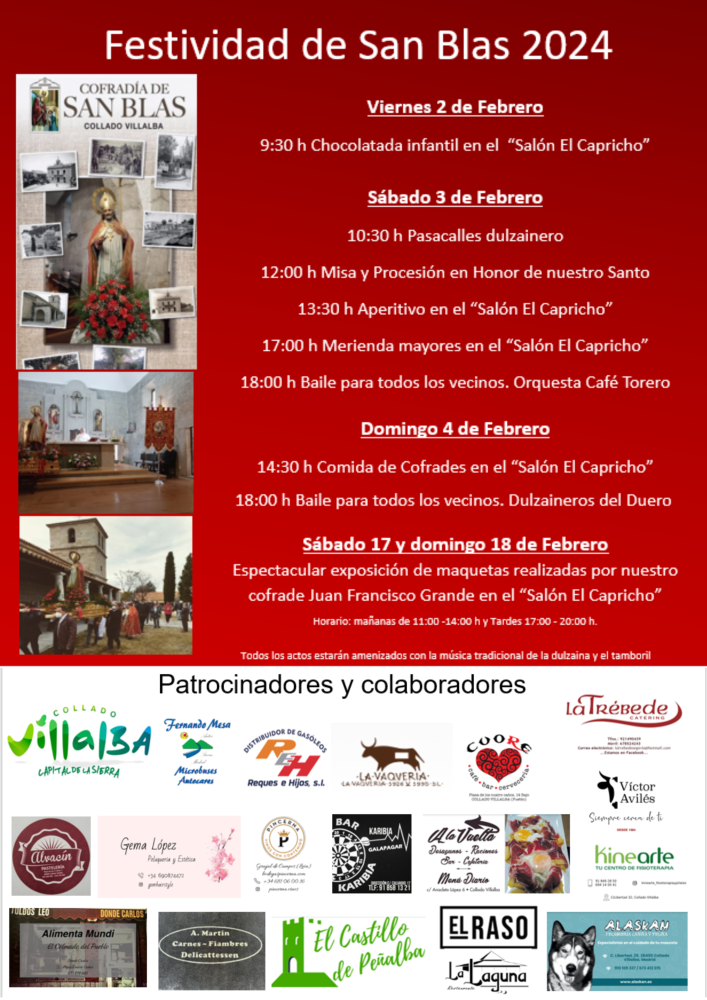 La Cofradía de San Blas, en colaboración con el Ayuntamiento de Collado Villalba, festeja, como viene siendo costumbre, su patrón con la celebración de diversos actos del 2 al 4 de febrero.