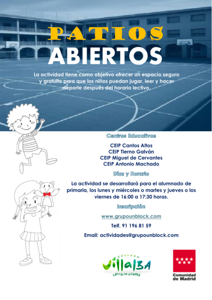 Este programa nace con el objetivo de fomentar la convivencia, la práctica deportiva y el aprovechamiento de los espacios escolares fuera del horario lectivo, el Ayuntamiento anuncia la puesta en marcha del programa Patios abiertos en cuatro centros de la localidad, una iniciativa promovida por la Comunidad de Madrid y subvencionada para facilitar el acceso gratuito de los escolares a los patios de los colegios.