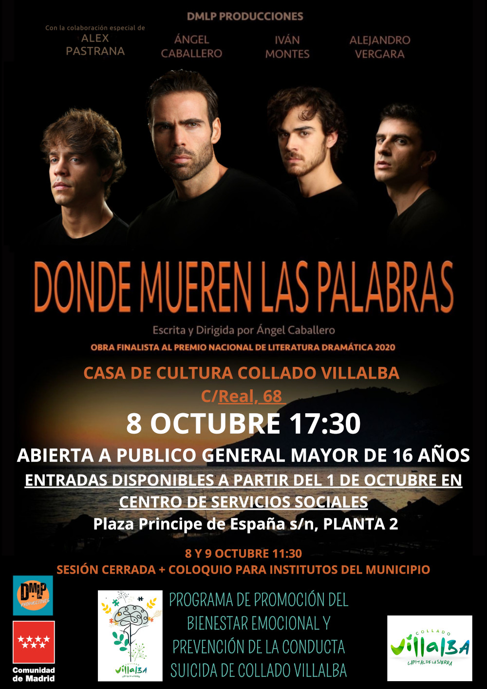 Otro de los platos fuertes de las jornadas será la representación de teatral de “Donde mueren las palabras”, obra finalista del Premio Nacional de Literatura Dramática 2020. El 8 y 9 de octubre habrá una sesión matinal para los alumnos de los institutos del municipio, mientras que el día 8, en horario de tarde, se realizará una representación abierta a todos los públicos (mayores de 16 años). Entradas disponibles a partir del 1 de octubre en Servicios Sociales.