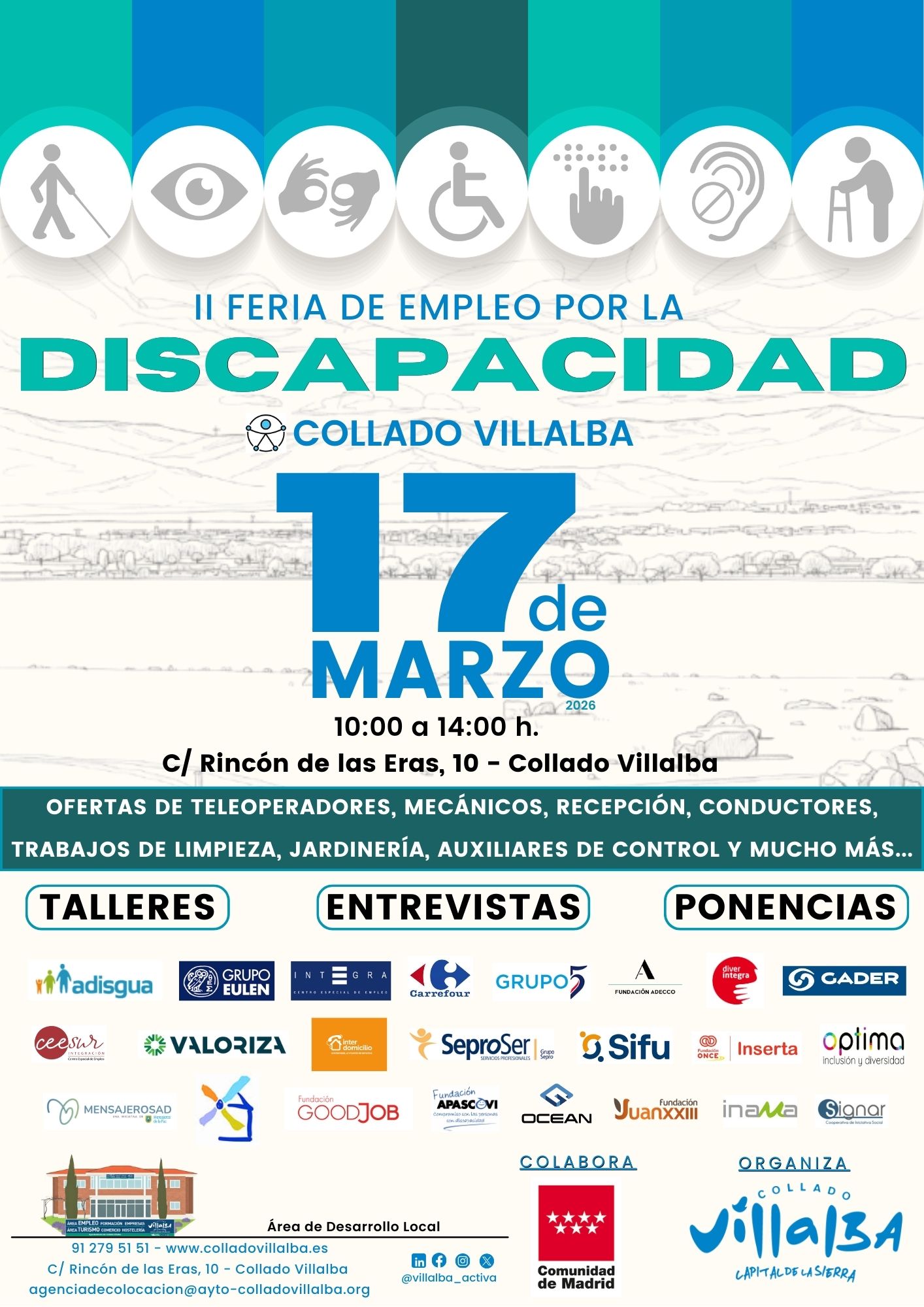 13-3-2026.-  El Área de Empleo, Formación y Empresas del Ayuntamiento del Collado Villalba, en colaboración con la Dirección General del Servicio Público de Empleo de la Comunidad de Madrid, organizan la segunda edición de la Feria de Empleo exclusiva para personas con Certificado de Discapacidad, que tendrá lugar el próximo martes, 17 de marzo, en el Centro de Iniciativas Municipales