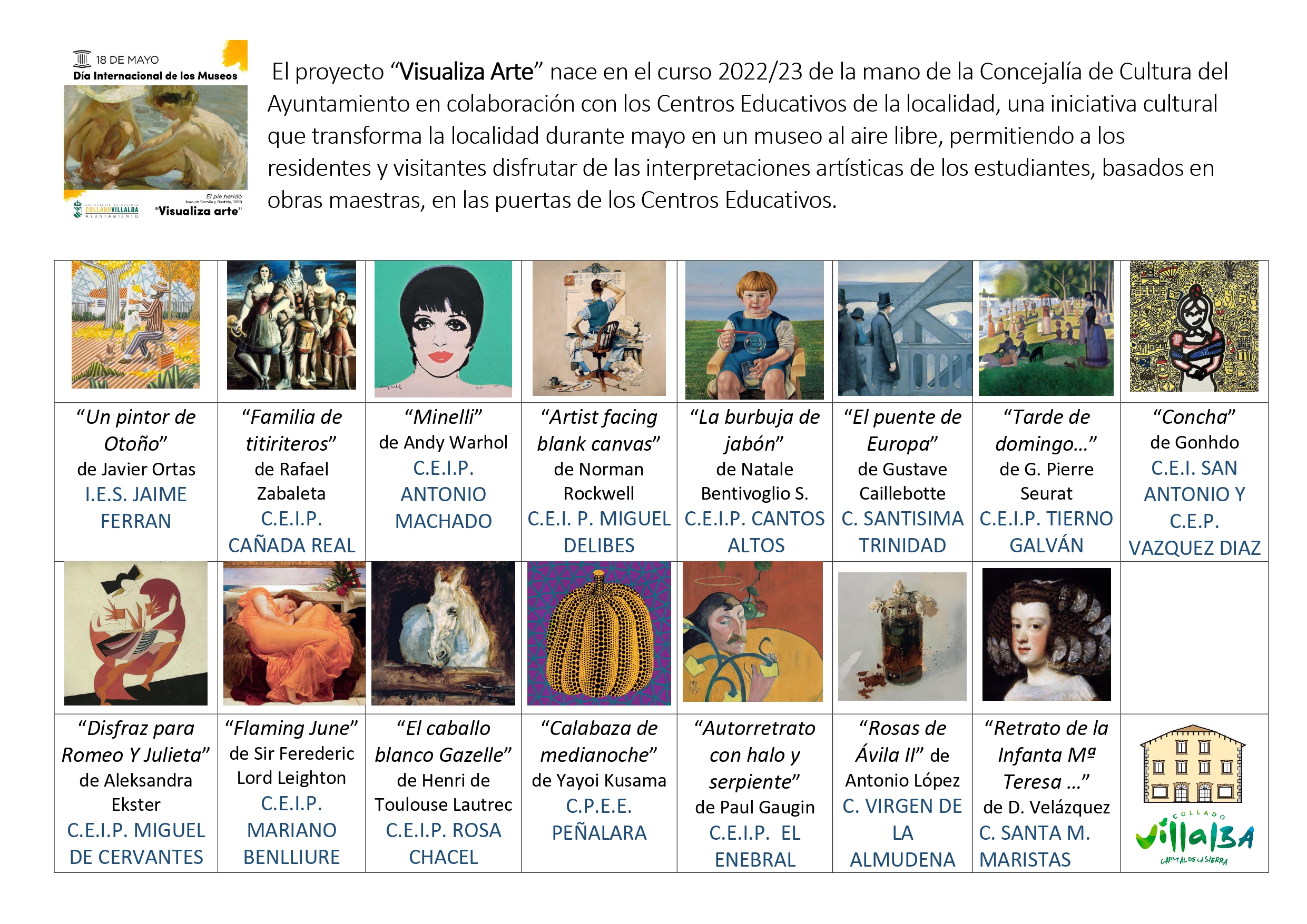 Si quieres más información sobre las obras de Arte o sobre los Centros Educativos donde se encuentran, accede al documento queencontraras más abajo y descubre más sobre Visualiza Arte.