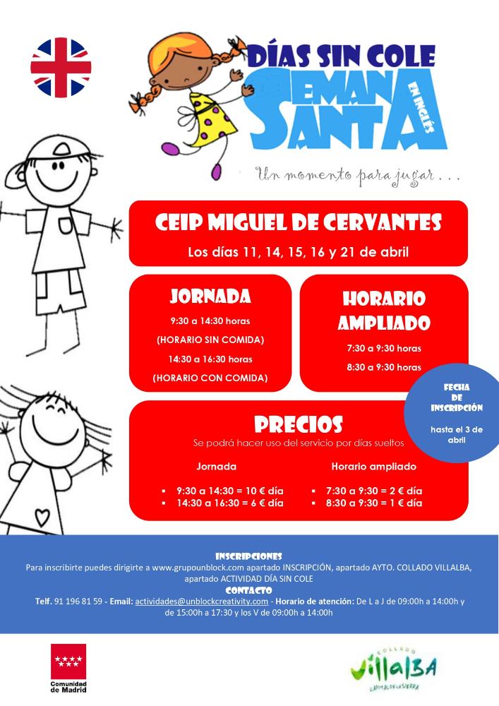 La campaña de colegios abiertos del Ayuntamiento de C. Villalba oferta las habituales plazas para esta Semana Santa, el CEIP Miguel de Cervantes. Los días 11, 14, 15, 16 y 21 de abril, los niños de El precio es de 16 euros por día para los alumn@s que se queden a comer y de 10 euros por día para los que se vayan a las 14’30 y no coman. El precio disminuye si se apuntan varios hermanos. Este programa, que también se hace durante todos los Días No Lectivos y las vacaciones de verano, pretende ayudar a los ciudadanos a conciliar la vida familiar y laboral. La temática del campamento será “UN MOMENTO PARA JUGAR”, donde los participantes conocerán nuestro entorno, disfrutarán con actividades y juegos cooperativos, artesanía con reciclado, cuentos, así como juegos y deportes. Las inscripciones a partir de hoy y hasta el día 3 de abril, a través de actividades@unblockcreativity.com. Disponibles menús aptos para alérgicos, celíacos… ![]()