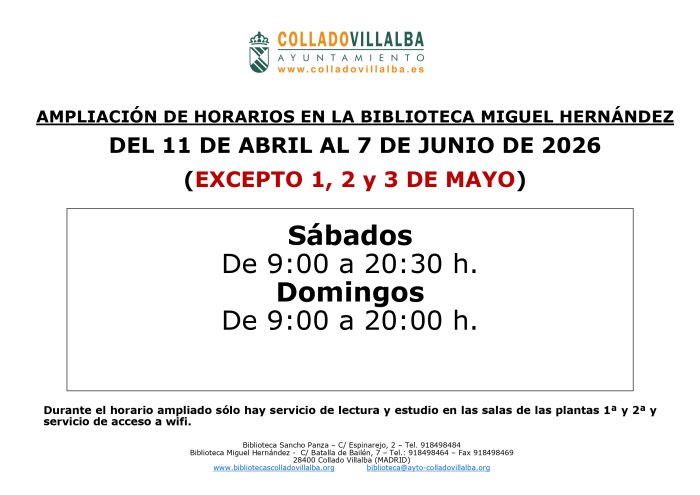 Ampliación de horario por exámenes en la Biblioteca Miguel Hernández del 11 de abril al 7 de junio de 2026.